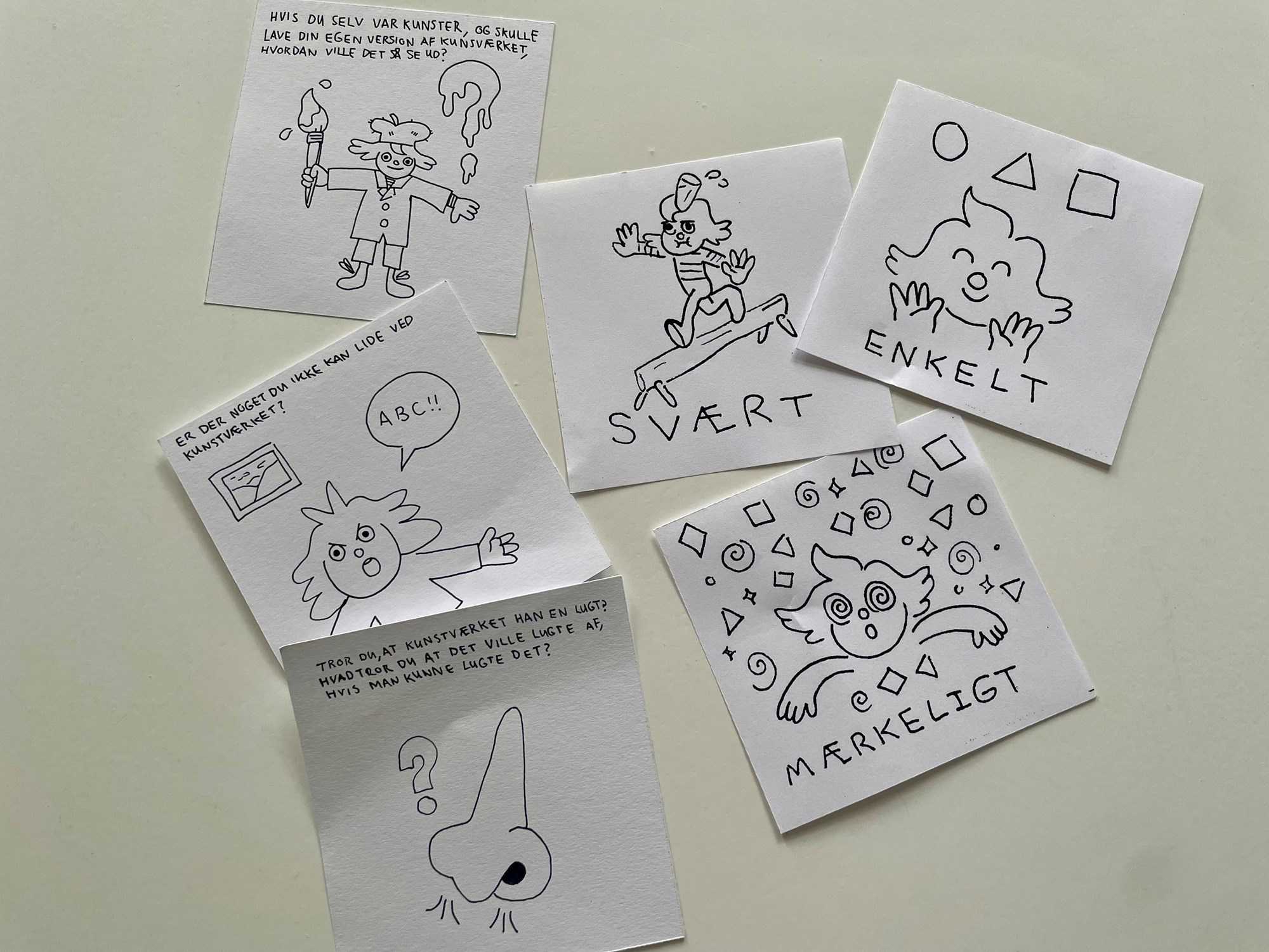I kufferten finder I illustrerede ordkort og spørgsmålskort samt papir, blyanter og farver. Brug kortene til at undersøge og udforske samtidskunsten i udstillingerne, skabe refleksion og glæde over mødet med kunsten.