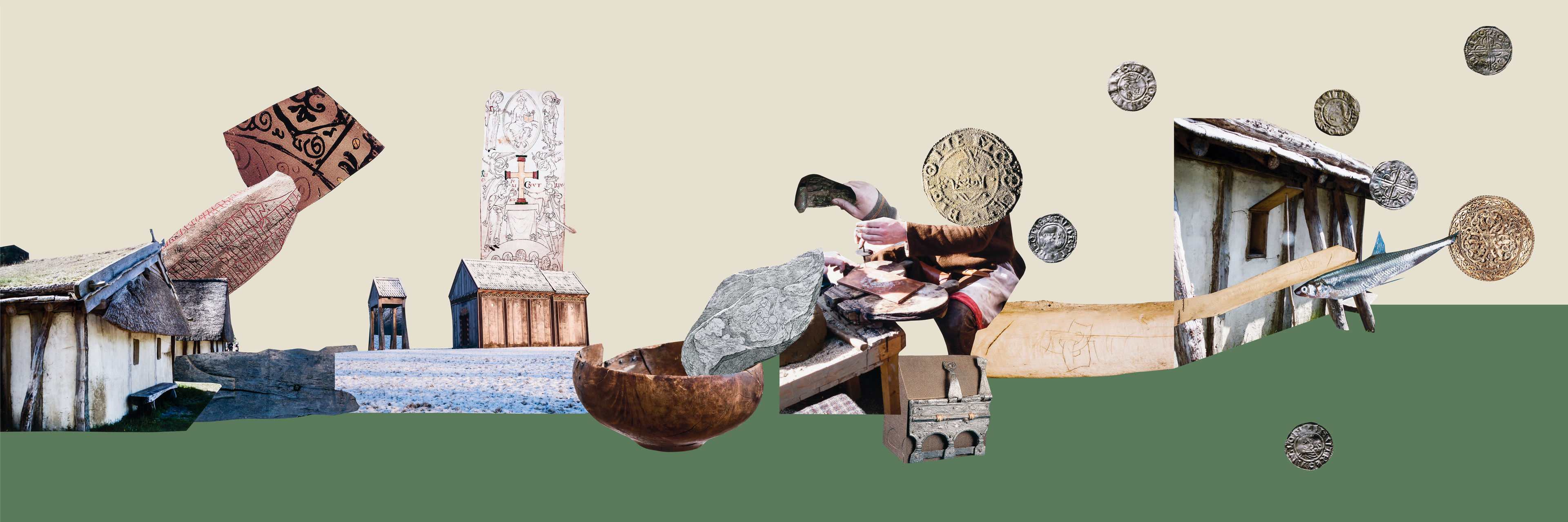 Træskålen, i midten af collagen, er drejet i takstræ. Takstræ skulle i 1000-tallet hentes i Mellemøsten. Skålen her er fundet ved Viborg Søndersø.