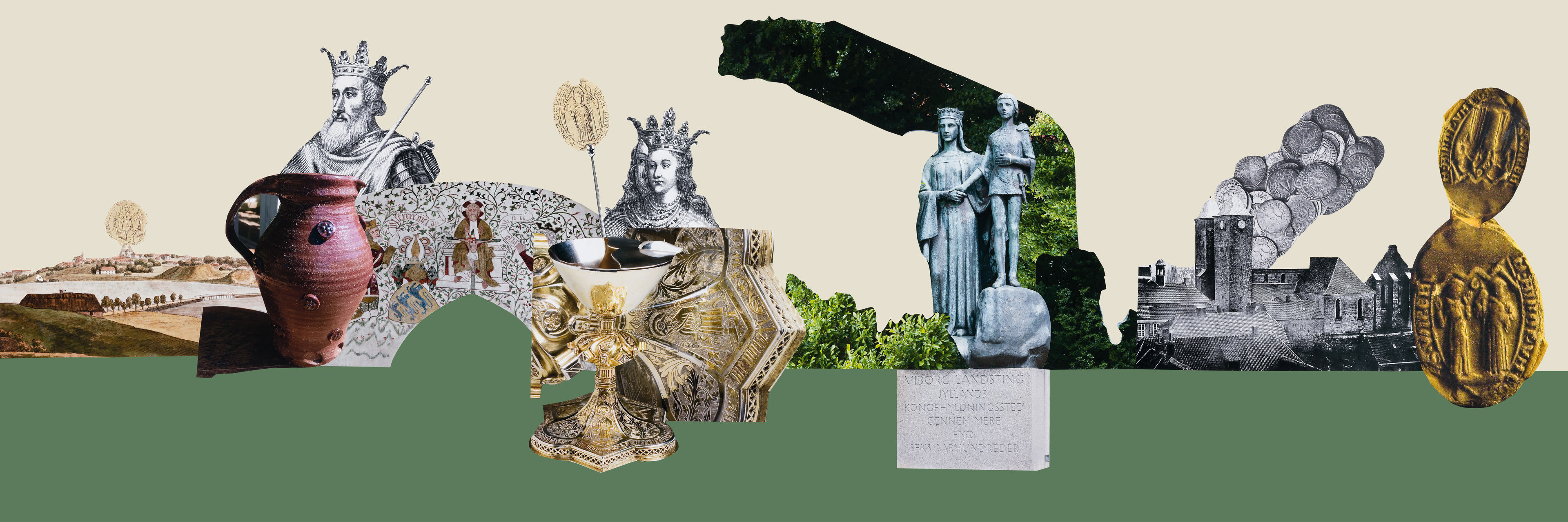 Yderst til venstre i collagen er Erik Menveds (1274-1319) borg på Viborg Borgvold. Den blev opført i 1313, men allerede nedrevet i 1320. I dag findes kun Store Borgvold, men frem til 1850 kunne man også se Lille Borgvold, som industritegner Ole Jørgen Rawert (1786-1851) tegnede i 1821. Bygningen af Borgvold og en række andre borge i Jylland skete efter et oprør mod kongen bl.a. på landstinget i Viborg. Sjællandske Krønike beretter om Erik Menved: "Han byggede nye borge og forstærkede de gamle, og således betvang han omsider jydernes gamle stivsind".