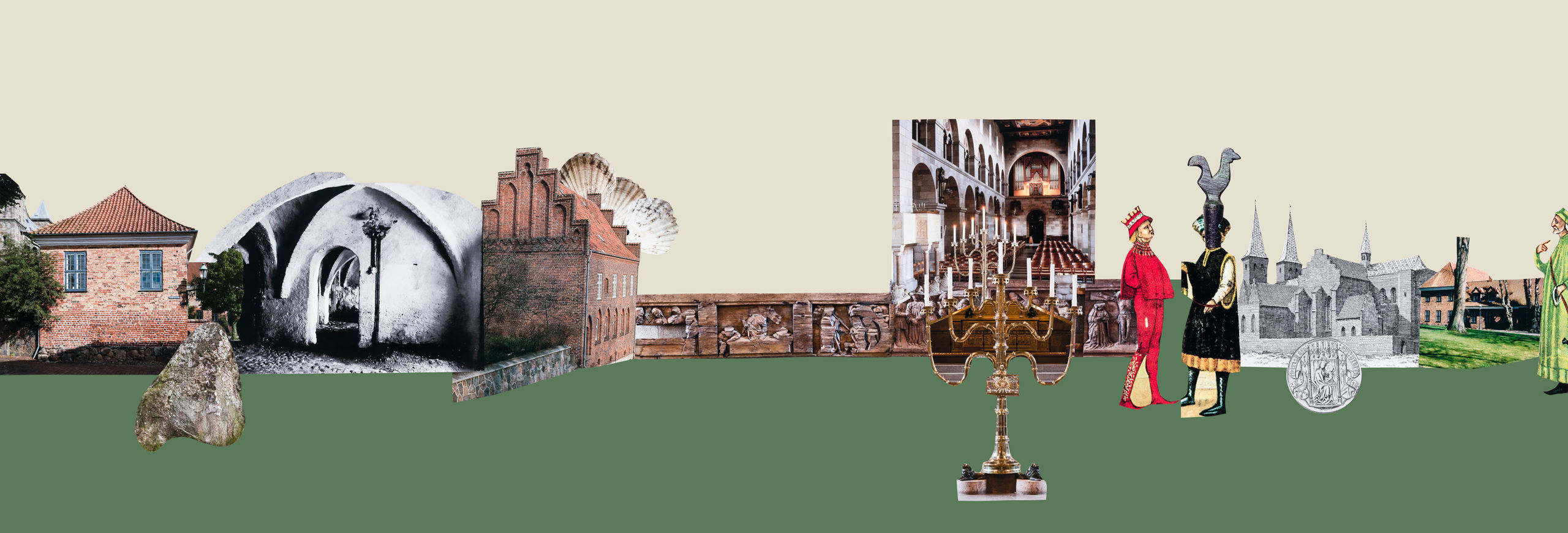 Den træskårne frise, der er ca. midt i collagen, fortæller Kristi lidelseshistorie fra korstolene i Viborg Domkirke og er opsat i koret efter kirken brændte i 1501. De fem her gengivne felter viser Kristi gravlæggelse, opstandelsen, nedfarten til dødsriget, korsbæringen og korsfæstelsen.