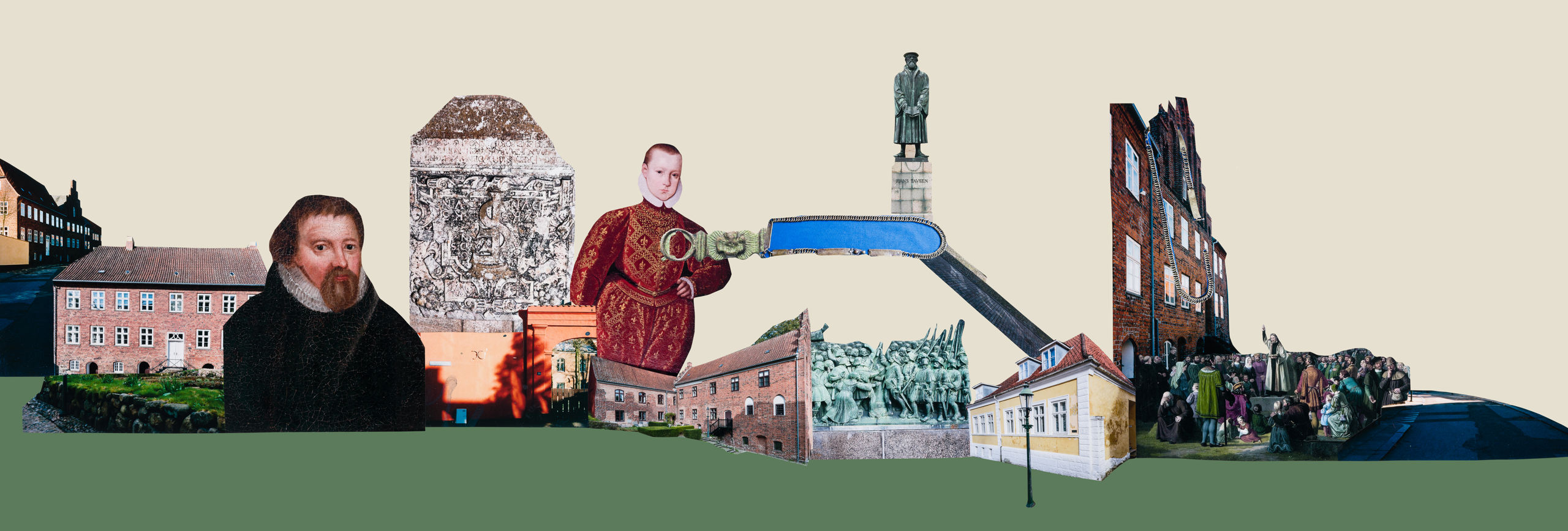 Reformationen i Viborg er en af de helt centrale begivenheder i byens historie, centreret omkring den tidligere munk Hans Tausen. Maleriet af Hans Tausen, der ses i forgrunden i venstre side af collagen, har tidligere hængt i Gråbrødre Klosterkirke, men hænger nu i Asmild Kirke, hvorimod selve statuen, der stikker op, til højre for midten i collagen, befinder sig foran Ribe Domkirke.