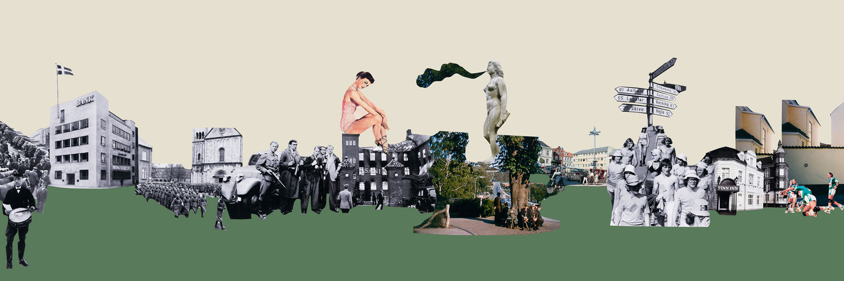 Byens tromme lød frem til ca. 1940. Sidste trommeslager, som ses i forgrunden på collagen, var væver Jens Ravn, der annoncerede stort og småt i byens gader.