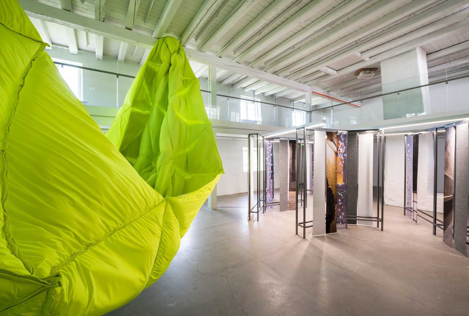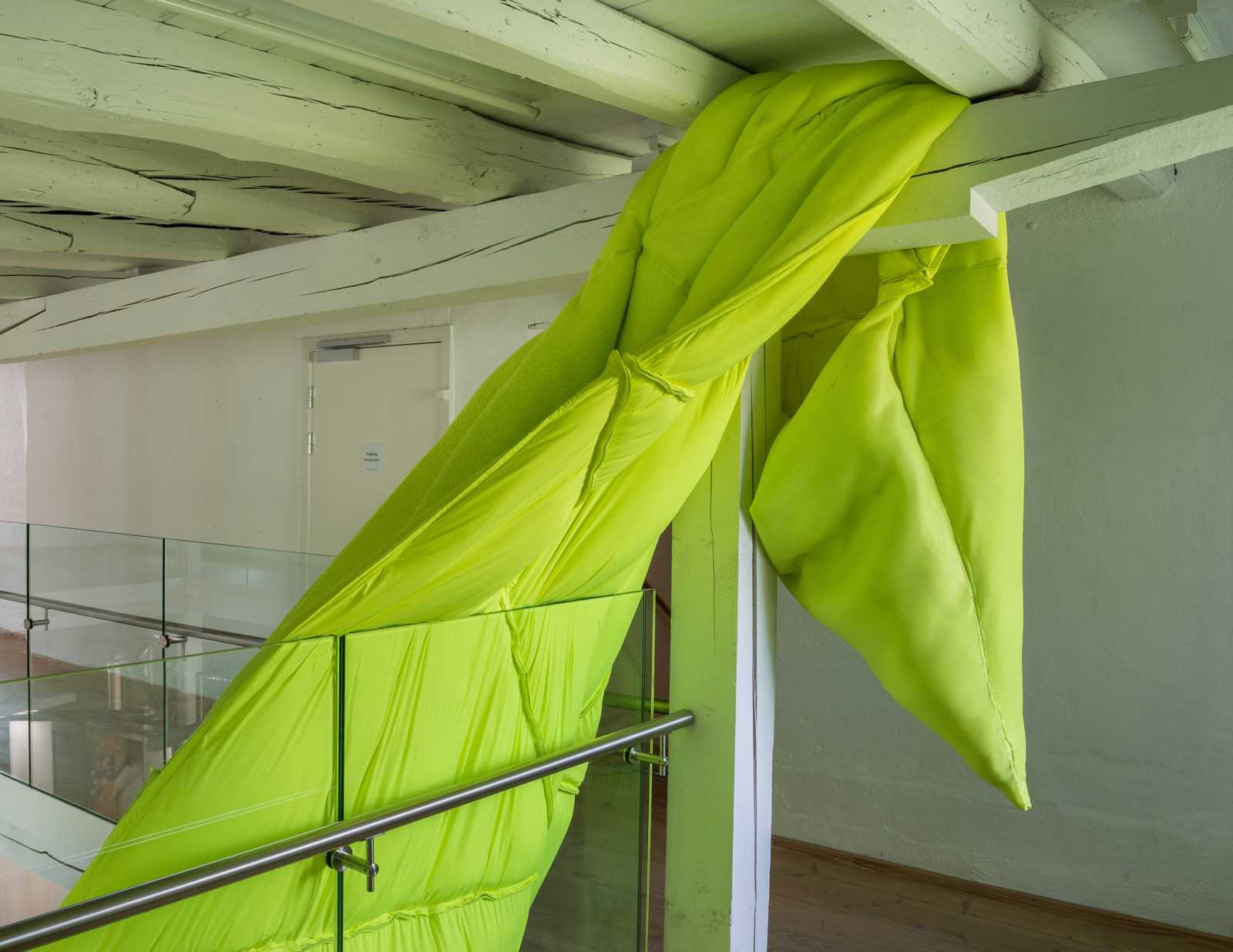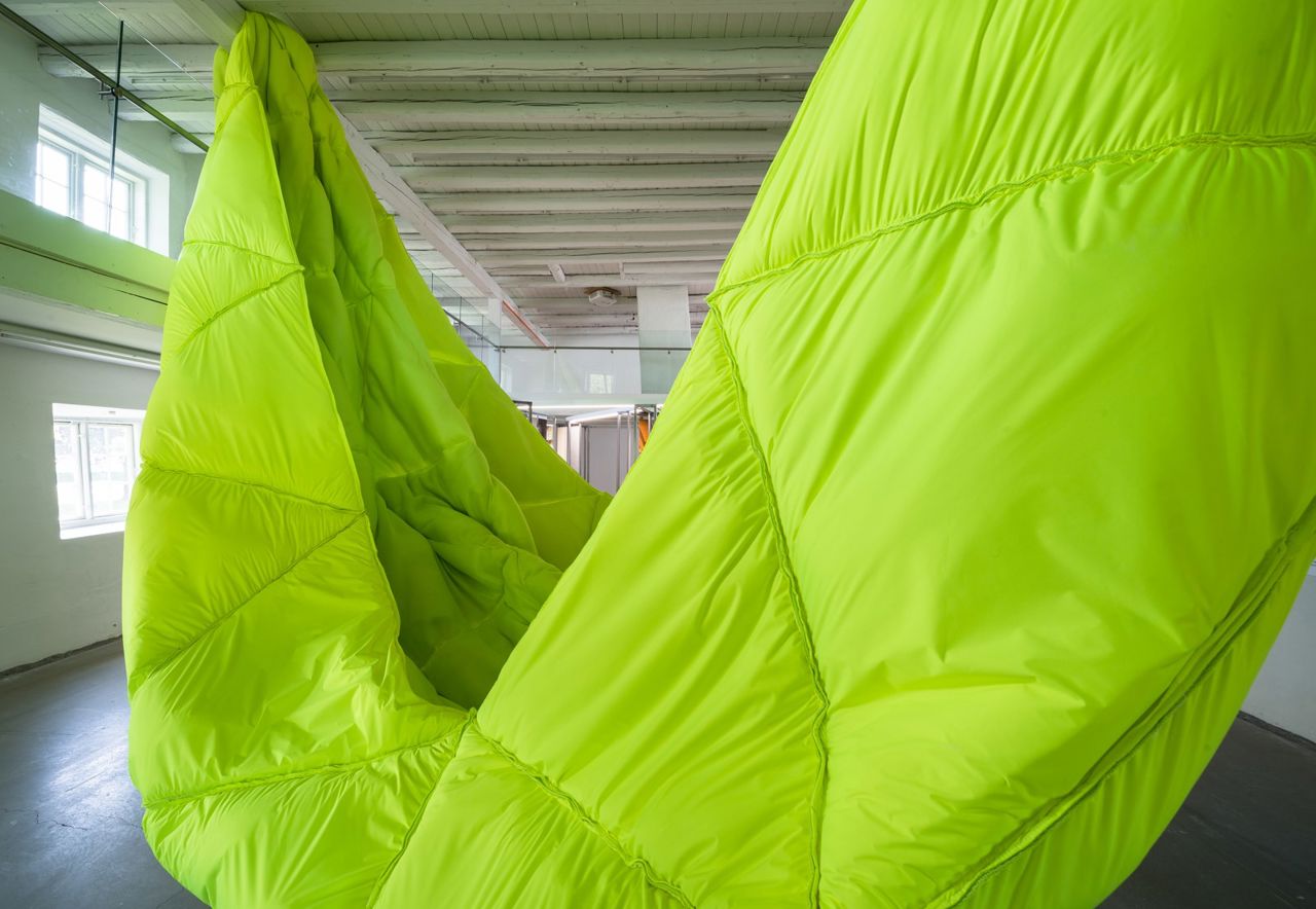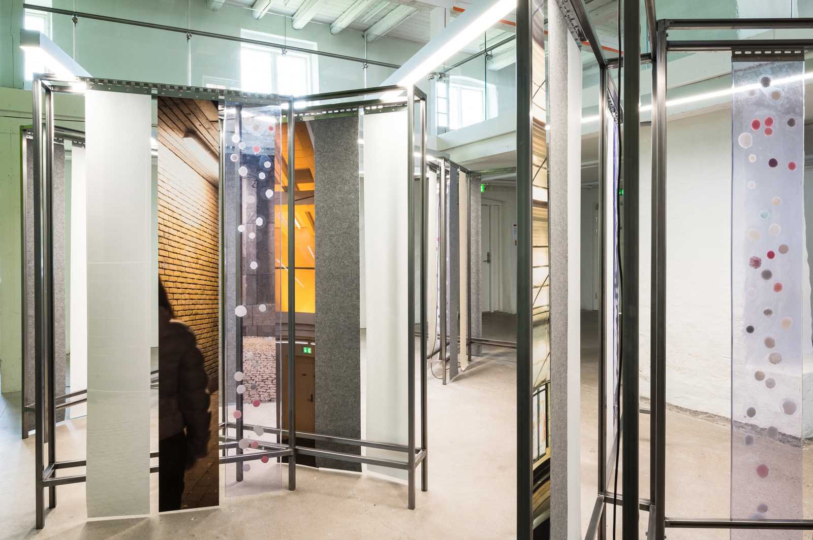 Indendørs vil Guttormsens installation i den ene del af Østfløjen byde beskueren indenfor i trange, men uoverskuelige rum. De lodrette flader i disse rum er ikke faste vægge, men lamelgardiner monteret på stålkonstruktioner, illumineret af et loft af lysarmaturer. I den anden del af Østfløjen møder beskueren Ostermeyers frithængende tekstilskulptur i det dobbelthøje udstillingsrum. Den store genkendelige og alligevel afvisende skulptur skaber en følelse af kontrast og fremmedgørelse hos beskueren.