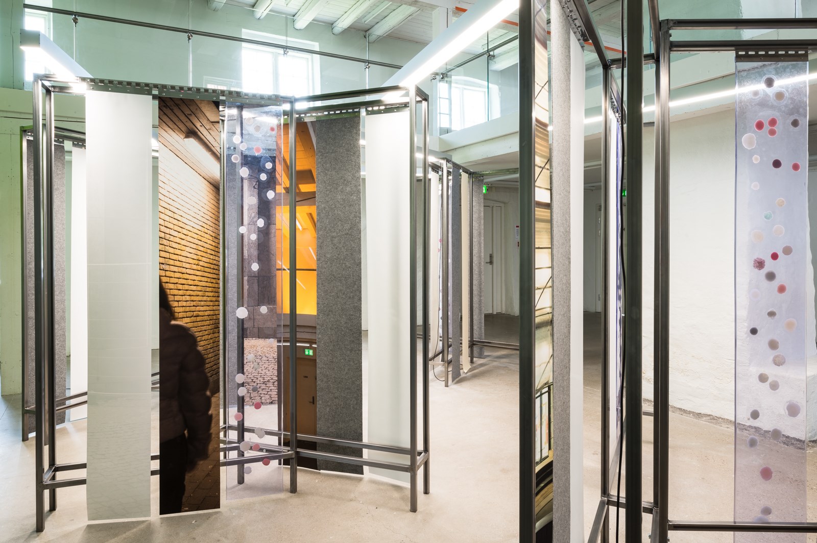 Indendørs vil Guttormsens installation i den ene del af Østfløjen byde beskueren indenfor i trange, men uoverskuelige rum. De lodrette flader i disse rum er ikke faste vægge, men lamelgardiner monteret på stålkonstruktioner, illumineret af et loft af lysarmaturer. I den anden del af Østfløjen møder beskueren Ostermeyers frithængende tekstilskulptur i det dobbelthøje udstillingsrum. Den store genkendelige og alligevel afvisende skulptur skaber en følelse af kontrast og fremmedgørelse hos beskueren.